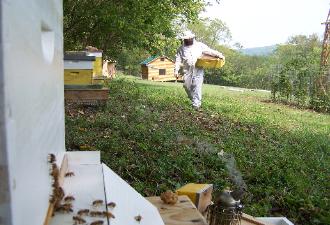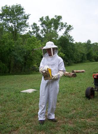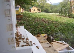 There are so many things to share about our life on Straight Creek Valley Farm in southern Ohio. Everything has been a learning experience for this New York City born and raised lady, but on this page I’d like to share what we have learned after nine seasons of bee keeping. My husband Greg was born and raised in the country, and his grandfather, now long passed away, was a bee keeper. Greg remembers as a little boy following his grandfather out to the hives and watching him work the bees and Greg has always dreamt of keeping bees himself. So after we bought the farm in the spring of 2003, Greg read all the bee books that he could get his hands on, learned as much as he could from the Internet, and finally, ordered a bee hive and some equipment from Bee Commerce. He built the hive, made up of two deep hive boxes and three shallow boxes called supers, in our city basement over the winter. We then ordered five pounds of live bees and a marked queen over the internet and sat back to wait patiently until spring when the bees would be shipped. On a designated day in the spring, the live bees arrived at our city post office, much to the distress of the post office workers. Bee Commerce had told us the bees’ preplanned arrival date so that I could call the post office and advise them of the shipment. Mail carriers will not deliver live creatures, so it was important that the post office had a phone number so that they could reach me immediately after the bees’ arrival. We did not want our bees sitting in a hot back room or on a delivery dock for long. The post office called and told us with real concern that our bees were escaping and we needed to pick them up immediately! My husband could not leave work at that moment, so I hurried down to pick up the bees by my self. I had never met a honey bee before and I had no idea what to expect. As soon as I saw the bees, I could understand the post office’s distress about the “escape”. The wooden box holding our bees was surrounded by fifteen to twenty large local bee-like flying creatures. I could clearly see our smaller bees through the wire mesh of their travel cage. I could also hear their buzzing and I assumed that the larger locals were just curious and checking the new arrivals out. Several postal workers watched. I had an old blanket with me that I thought might help if the bees had in fact been escaping. I figured that I could wrap up the package of escaping bees in the blanket and avoid being stung. Even though the bees were not actually escaping, I was still glad to have the blanket. I tried to stay calm, and walked over to the packaged bees and whisked the larger bees away with the blanket. I then calmly picked up the packaged bees, amazed by the suddenly louder buzzing, and carried them out to my car. Thankfully, the local city bees did not follow me as I walked off of the loading dock. The postal workers seemed very relieved as I took the bees away. Later that afternoon, we drove out to Straight Creek with our buzzing cargo to introduce them to their new home. I will not give you all of the details of what we did and how we did it, but I will say that we followed the directions and advice set forth in Bee Keeping for Dummies. The book definitely provided us with the basic information we needed to start out as novice beekeepers. By the time it was fall, we knew that our first hive was healthy and had enough honey stored to get them through the winter. They did not, however, produce enough honey for us to harvest in their first season. That is because they were a brand new colony and had to spend their summer getting the hive ready for winter. We watched with fascination all summer. First, they drew out the new wax foundation, that we had placed in the hive frames, into wax comb. Once the comb was built, the queen began to lay her eggs in the lower brood chamber wax cells, and the workers began to fill the outside and upper chamber frames with the colony’s own honey stores to last them through the winter.. Things have a way of turning out though, because we did manage to harvest honey our first season as bee keepers. Earlier in the year, as we were ordering the standing seam tin roof for our farm cabin, we met a wonderful man named Jim Higgins. We had noticed that the building supply store where we purchased our roof had an indoor bee hive display along the back wall. My husband found the display fascinating and as we looked at the display, an elderly gentleman came up to us. We now know him as Jim Higgins, a much published and renowned bee keeper who, very fortunately for us, lives in southern Ohio. Jim later introduced us to two homeless bee hives, whose bee keeper had passed away over the winter. With Jim’s help we moved the hives to Straight Creek. The two established colonies set right to gathering Straight Creek pollen and nectar, and by early August they had filled a total of five supers. These five supers made up our first harvest. Once again, we followed the guide lines set down in Beekeeping for Dummies, adapting and learning as we went through the process. The book was very helpful indeed, and of course, our harvest was done the old fashioned way, with a hand cranked four frame extractor, a pot of hot water and two uncapping knives (so there was always a warm knife ready to cut through the cappings). Straight Creek Farm is off the grid, so we do almost everything the old fashioned way. (To learn about the details of our first honey harvest, click here). We ended up with about one hundred and sixty, twelve ounce, jars of clear light summer honey that we have enjoyed giving away to family and friends. We hoped to have a second somewhat smaller harvest in the fall, of the stronger goldenrod honey, but the extremely dry late summer and early fall weather made for a poor honey flow. We were still pleased though, with our first season of beekeeping, for our Straight Creek Honey in great demand. Perhaps it is because our 