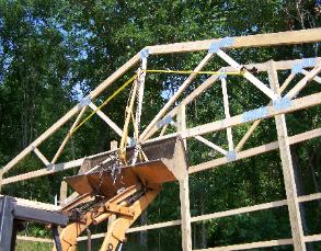 backhoe. We carefully set the straps so that we could raise the trusses with minimal stress